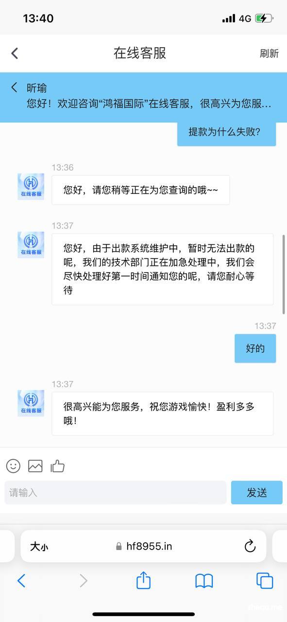 鸿福国际 网址https://m.hf8955.in 300块钱出不起 一直说系统维护 真他妈的黑b台 比少妇的b 还黑 希望大家避雷 萝卜服务器xycp999 加狗带cy147258 这些人真的是畜生来的 他妈的逼 玩欧洲杯 波胆 独赢都黑 谁去玩谁死 这种畜生