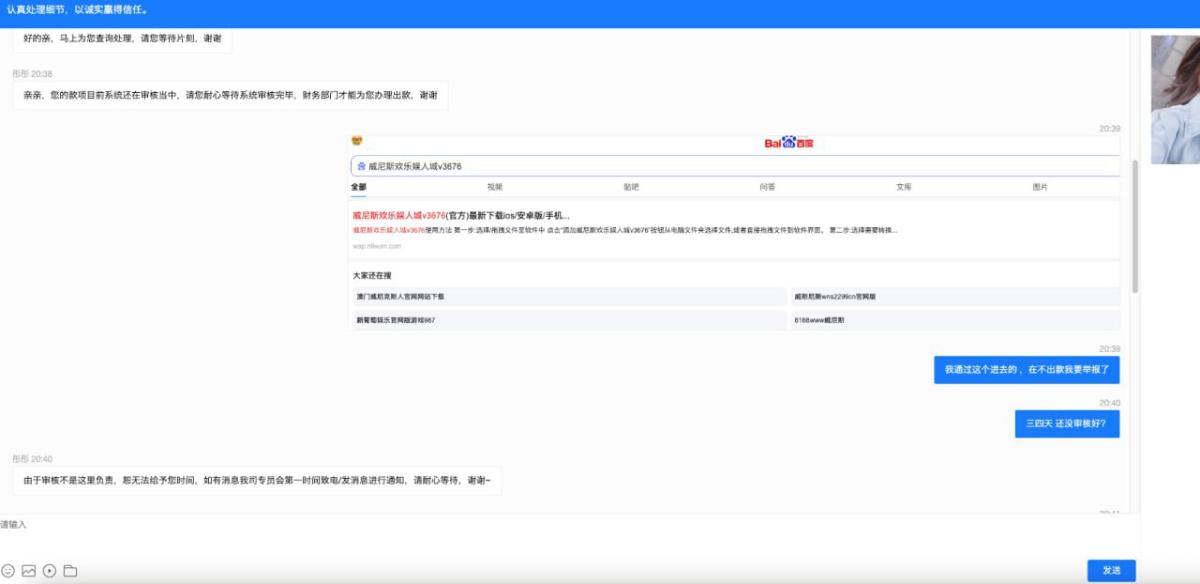 本人7月18号在网站注册到新葡京娱乐,充值两次,第一次输完,第二次充值赢三千来块,提款一直未到帐,询问客服一直是正在审核中,问客服需要配合什么,还是我到底那里违规,还是回答审核中。现在菠菜连一千都要黑吗,通过客服,知道此公司在菲律宾,请大家避坑。这是哪家傻逼公司,做百度推广,我以为起码有点格局,狗庄是真的黑啊