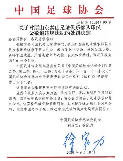 中国足协负责人介绍了对涉案足球从业人员的纪律处罚情况。依据《中国足球协会纪律准则》,经中国足协纪律委员会审定,给予金敬道等43人终身禁止在我国从事任何与足球有关活动的处罚;给予巴合江·吾尔满等17人禁止在我国从事任何与足球有关活动五年的处罚;原杭州绿城队球员沈刘曦,2013年已被处以终身禁止从事任何与足球有关活动的处罚,仍不知悔改,在此次案件中因开设赌场罪受到刑事处罚,中国足协再次进行通报,要求全行业对其严格执行禁业处罚。