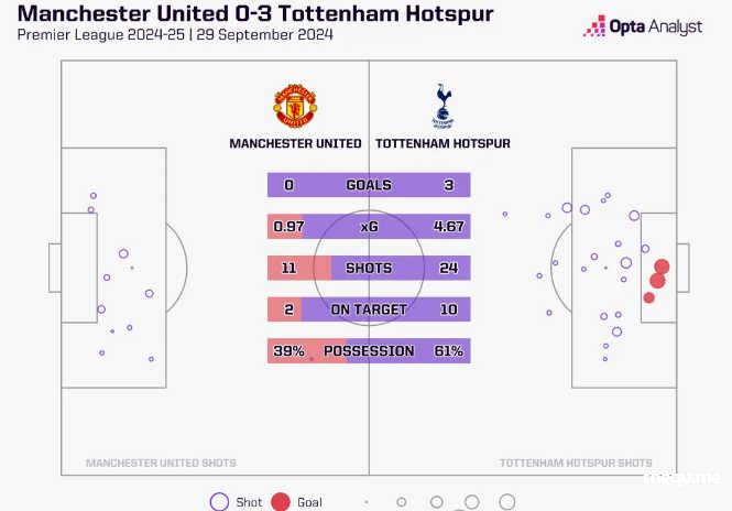 帅位拯救战,波斯特克格鲁完胜,不仅赢球,而且是完胜,无论是战术针对、人员状态配置、临场调遣,热刺都是做的更好的一方,全场比赛曼联的首发球员只有奥纳纳和加纳乔可以说在线,其余大部分球员都在梦游。德里赫特、B费、达洛特、拉什福德均失误频频,B费的那张红牌判罚没有问题,意外滑倒了仍然可以收脚,估计只是一种情绪的发泄,而这种情绪也蔓延给了全队,都在急躁,都在失误,越急躁越失误,越失误越急躁,然后无限恶性循环。