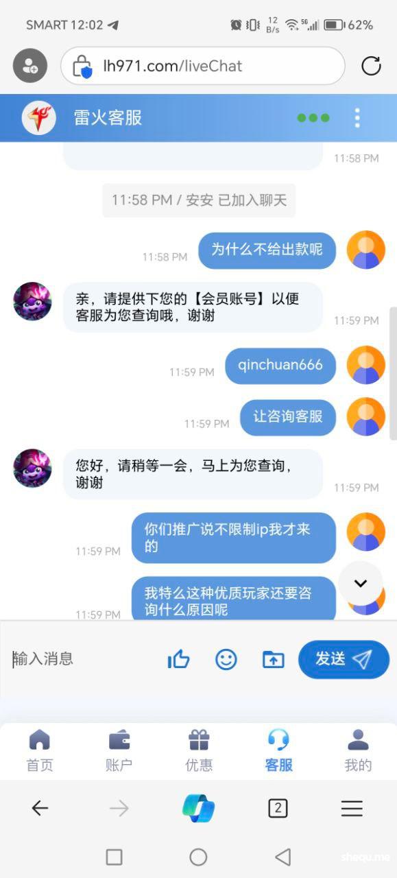 本人在菲做点小生意,唯一的爱好就是每天打点转转,今天经电报介绍去雷火平台, 充值300打麻2拉到1500提款半小时没到账去咨询客服,客服回复随机抽查请耐心等待结果!本人没领过任何彩金,也是第一次在雷火娱乐。赌友圈流行一句话,电子都卡的台子绝对是垃圾台子!本人在开云系列台,bm体育,球速体育等娱乐过很久,账号相同可查,重未发生过此类扎心的问题!忘广大网友远离黑平台,还网赌圈一份宁静,最后说一句,真的狠搞心态!