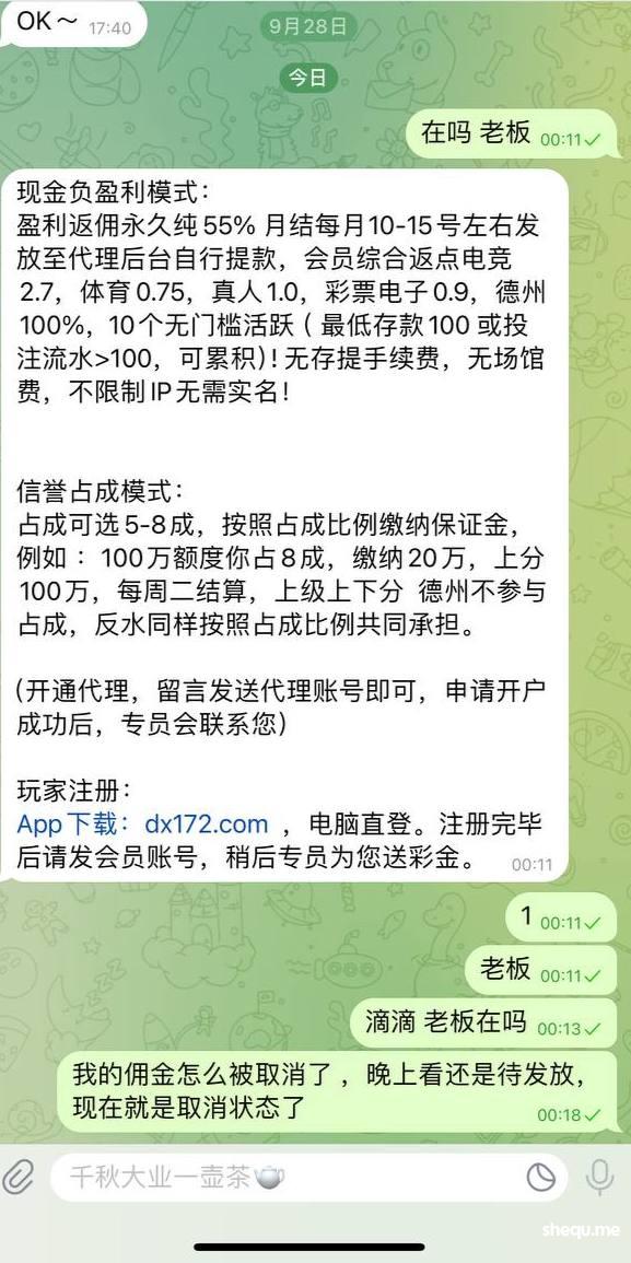 9月注册的代理线 朋友那边的大哥玩的 本身大哥在那边线就输了小百万了,不太想玩了 就换到我这边 也是输钱的 朋友那边线就没玩了, 只是10月红了2000U 朋友那边红了2000U 一共不到4000U 但是代理线负盈利9月 1.6万U 直接给我取消了
