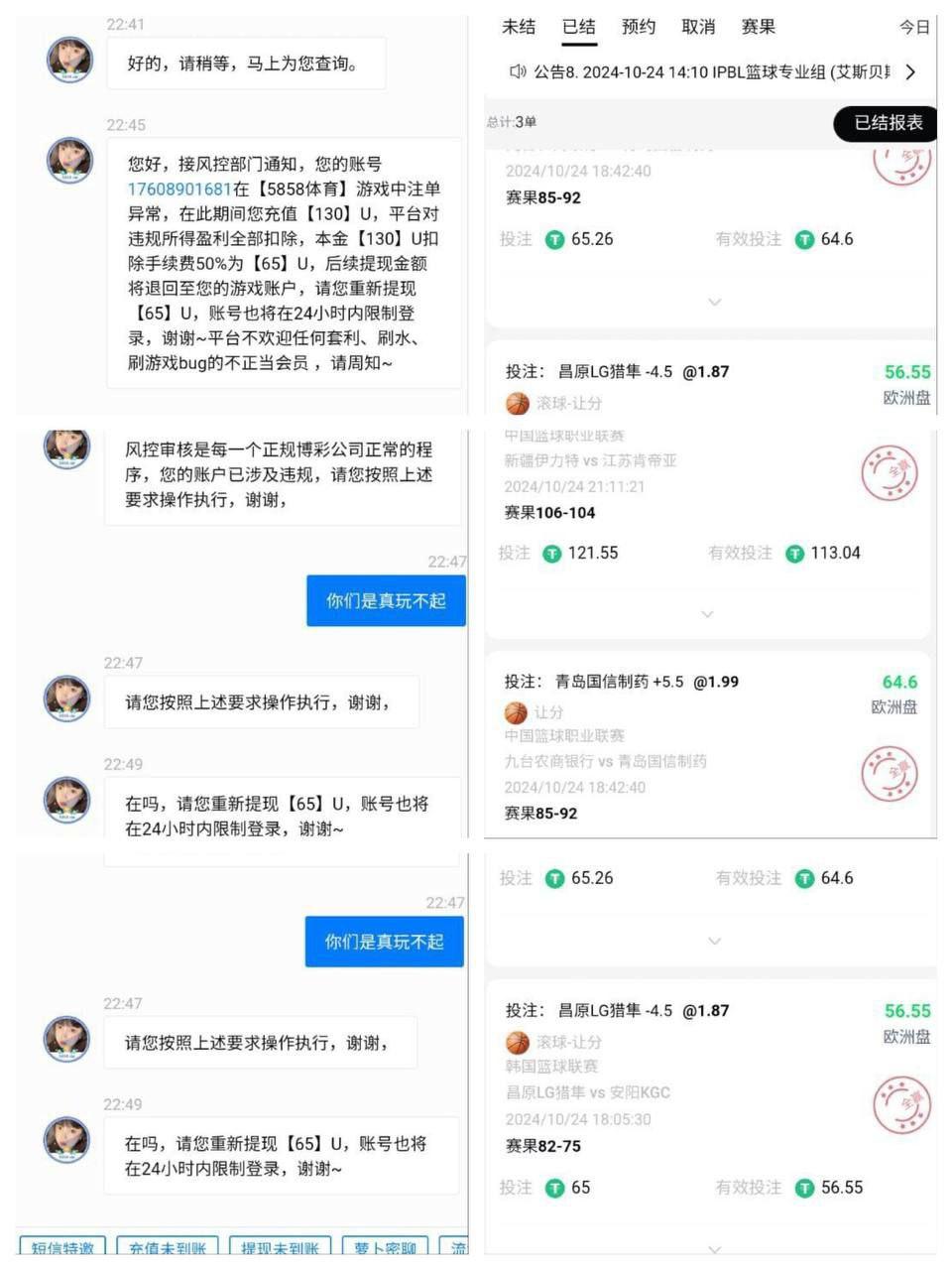 投注3手篮球 赔率分别为1.87 1.93 1.99给平台判定为刷水套利玩家 存了130u 没有领取任何优惠赢到364u提款被拒 仅给提款65u 大家注意吧!
