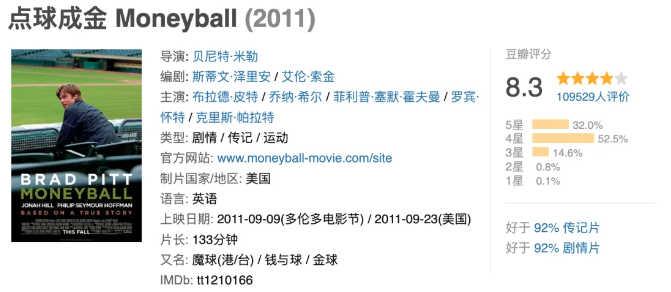 贝内特·米勒执导,布拉德·皮特和乔纳·希尔主演的电影《点球成金》(Moneyball),这部电影讲述了一个真实的故事:奥克兰运动家棒球队的总经理比利·比恩在预算有限的情况下,与耶鲁大学经济学毕业生彼得·布兰德合作,革命性的利用“棒球统计学”(Sabermetrics)来评估球员并组建球队,在没有明星球员的情况系创造了MLB的美联连胜纪录并打入季后赛。